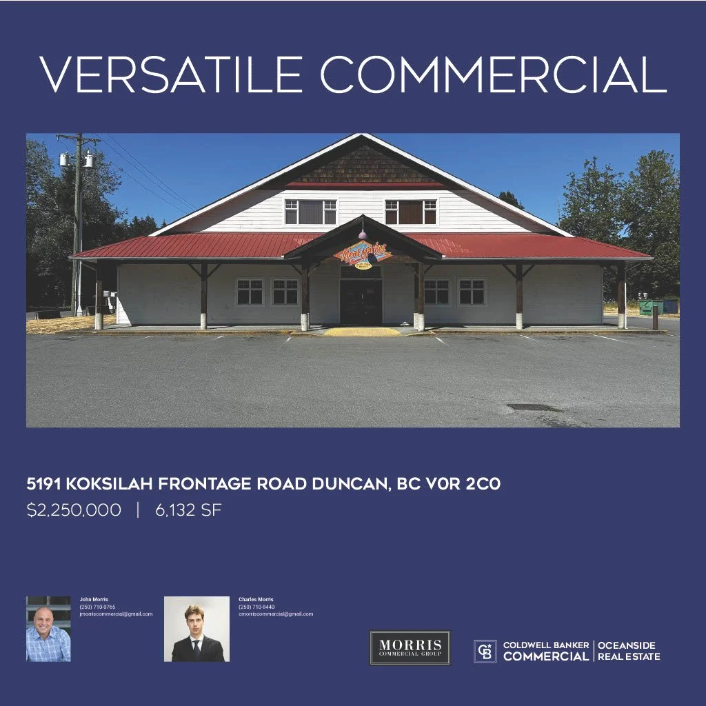 Rare opportunity to acquire a high-end commercial building with exceptional visual exposure and Trans Canada Highway access. Currently operating as a butcher/market, this versatile property is adaptable for various uses permitted under the C5 Village Commercial Zone, including Agricultural / Horticultural Supply Sales, Artist Studio, Bakery, Cafe, Catering Services, Financial Institution, Health Studio, Market, Office, Personal Service, Restaurant, Retail Sales and a Dwelling as an accessory use. Located just south of Duncan in the core commercial area of the Cowichan Valley, an area experiencing significant population growth and undergoing major infrastructure projects to support future development. Some equipment used in the market operations may be available for purchase to maintain the existing use if needed. Do not contact staff or owners directly. All sizes are approximate and should be verified by the Buyer.