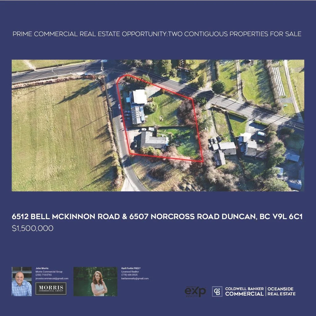 Land Assembly consisting of two commercially (C3 and C2) contiguous properties located on a prominent corner of Bell McKinnon and Norcross Road. Located on the SW corner, ~1 km from the new hospital, this area is identified in the Official Community Plan as Employment Lands - Mixed, highlighting its potential for future development. Presently, the properties have a commercial unit (owner occupied - vacant possession) and a residential unit, providing income potential. The properties are exceptionally well-positioned for future growth in the area as the hospital nears completion. The combined lot size is approximately 40,946 sq ft, consisting of 22,651 sq ft at 6512 Bell McKinnon and 18,295 sq ft at 6507 Norcross. Buyers are encouraged to satisfy themselves regarding the development potential and zoning by conferring with North Cowichan. Please do not approach the owner or tenants directly.