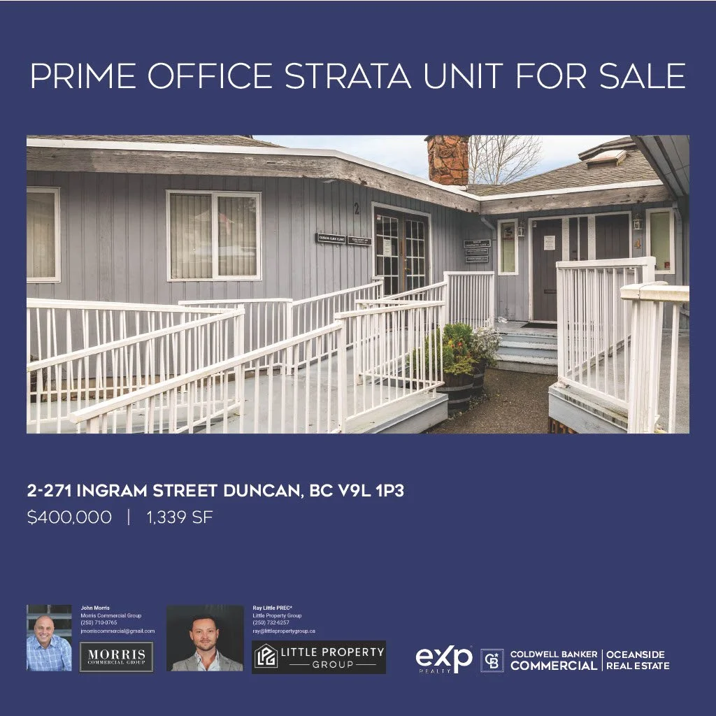 Prime Office Strata Unit for Sale – Ideal Owner-Occupier Opportunity. Own this charming 1,339 sq ft strata office in historic downtown Duncan, a growing area with limited office space available. Features include 4 private offices, boardroom, welcoming reception, kitchenette/staff area, plus a loft ideal as extra workspace with built-in desk and shelving. Fully self-contained for privacy, with rear entry and an accessible front entrance, 2 dedicated parking stalls, and ample street parking. Perfect for professionals choosing ownership over leasing, steps from shops, parks and amenities. The low strata fees of $300 per month includes hydro. Rare find—secure this attractive option for your business today. Measurements approximate; buyer to verify.